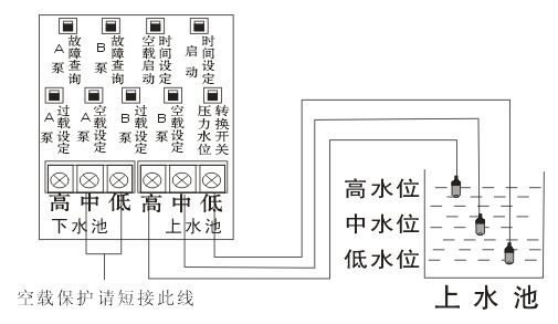 設(shè)置空載保護(hù)后,下水池不能接探頭。上水池的水用到中水位時(shí)會(huì)開(kāi)始抽水,抽到高水位會(huì)水滿(mǎn)停機(jī),低水位訊號(hào)線(xiàn)起回路作用。