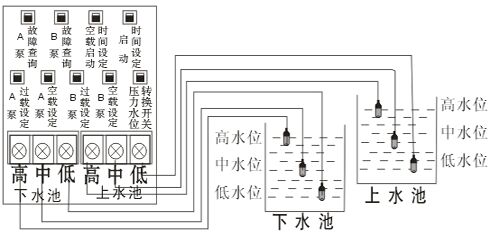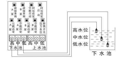 下水池用訊號(hào)線(xiàn)需跟廠(chǎng)家另行訂購(gòu),不能設(shè)置空載(即空載為000)。上水池的水用到中水位時(shí)會(huì)開(kāi)始抽水,抽到高水位會(huì)水滿(mǎn)停機(jī)。下水池滿(mǎn)至高水位時(shí)會(huì)開(kāi)始抽水,抽到中水位時(shí)會(huì)停機(jī),即缺水保護(hù)。上、下水池之低水位訊號(hào)線(xiàn)都是起回路作用。