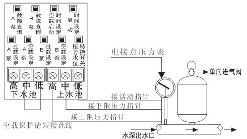 b、上水池高、中、低控制線(xiàn)與電接點(diǎn)壓力表指針接駁 應(yīng)是