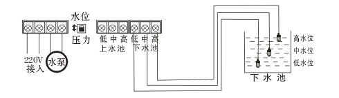 下水池用訊號線需跟廠家另行訂購,不能設置空載(即空載為000)。上水池的水用到中水位時會開始抽水,抽到高水位會水滿停機。下水池滿至高水位時會開始抽水,抽到中水位時會停機,即缺水保護。上、下水池之低水位訊號線都是起回路作用。