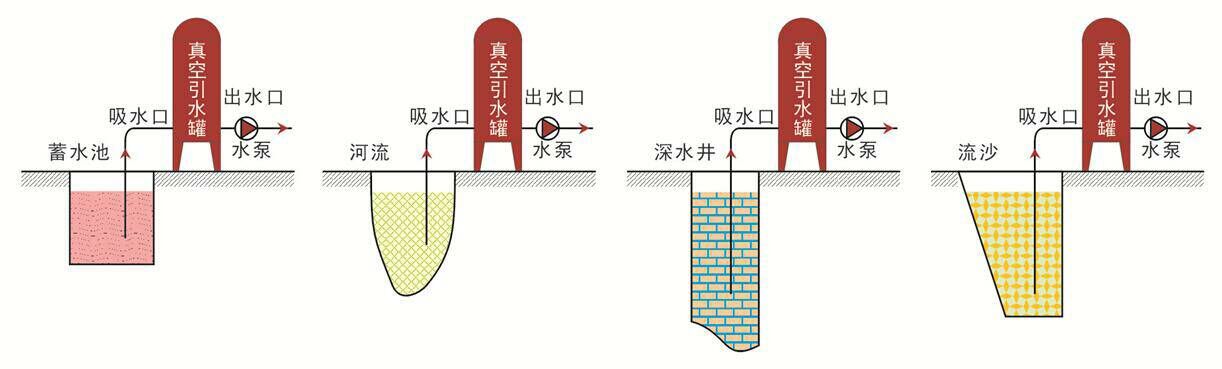 使用前真空罐內(nèi)須加滿水,當(dāng)罐內(nèi)的水被水泵吸出,罐內(nèi)產(chǎn)生負(fù)壓(真空)后,由于大氣壓的作用,蓄水池內(nèi)的水通過吸水管進(jìn)入真空罐,通過水泵源源不斷的供水。