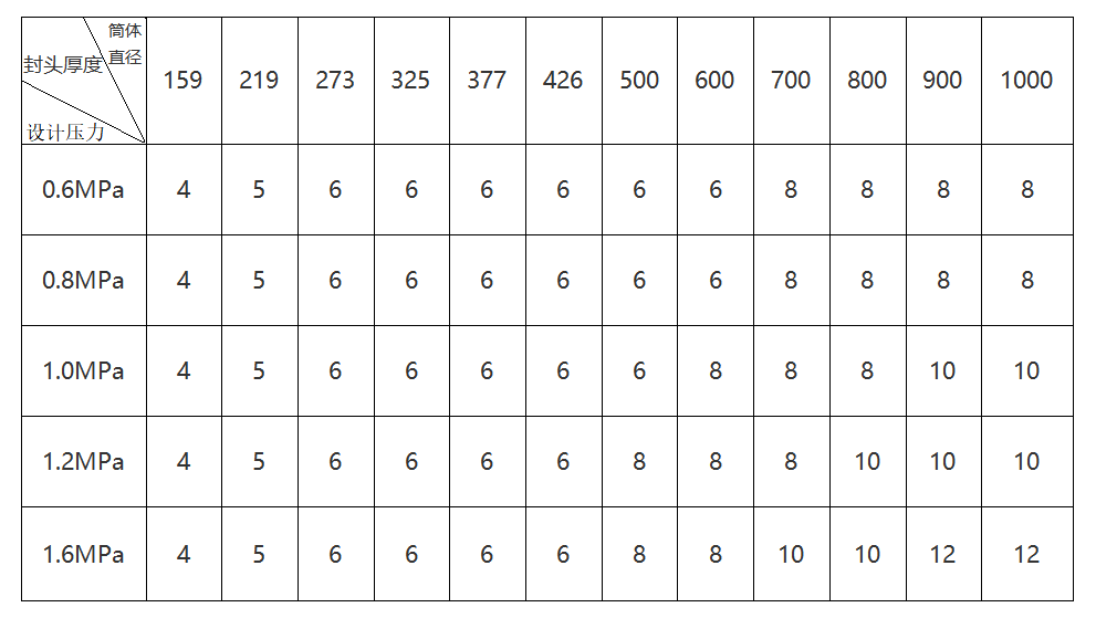 四、筒體直徑、設計壓力及封頭壁厚一般對應表